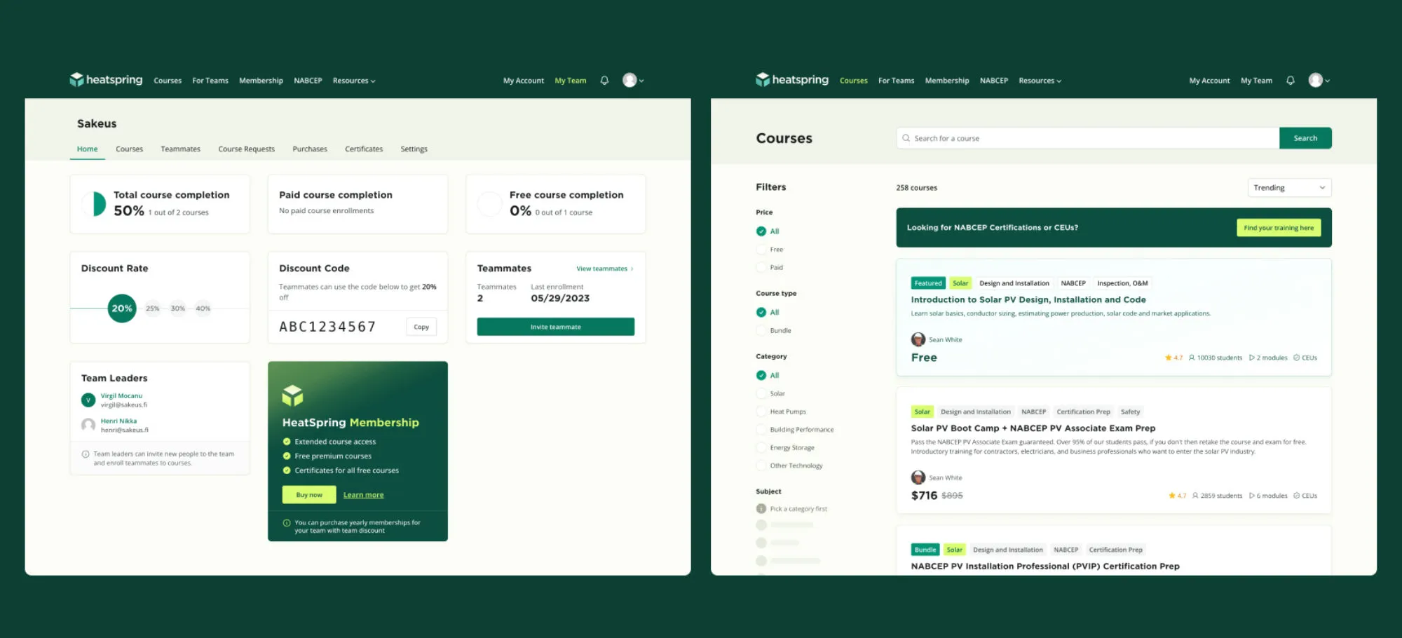 HeatSpring kouluttaa uusiutuvan energian ja vihreän rakentamisen ammattilaisia – yli 100 000 rekisteröitynyttä käyttäjää ja yli 250 kurssia. Alustalla kerätään opintopisteitä sertifikaatteihin, joita Pohjois-Amerikan valmistajat, lupavirastot ja kannustinohjelmat edellyttävät. Toisin sanoen: kun Yhdysvalloissa asennetaan aurinkopaneeleja, HeatSpring on usein siellä taustalla.
